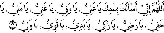 Yâ kâfiya manistakfâhu, yâ hâdiya manistahdâhu, yâ kâli`a manistaklâhu, yâ rô`iya manistar’âhu, yâ syâfiya manistasyfâhu, yâ qôdhiya manistaqdhôhu, yâ mughniya manistaghnâhu, yâ mûfiya manistawfâhu, yâ muqowwiya manistaqwâhu, yâ waliyya manistawlâhu. (60)